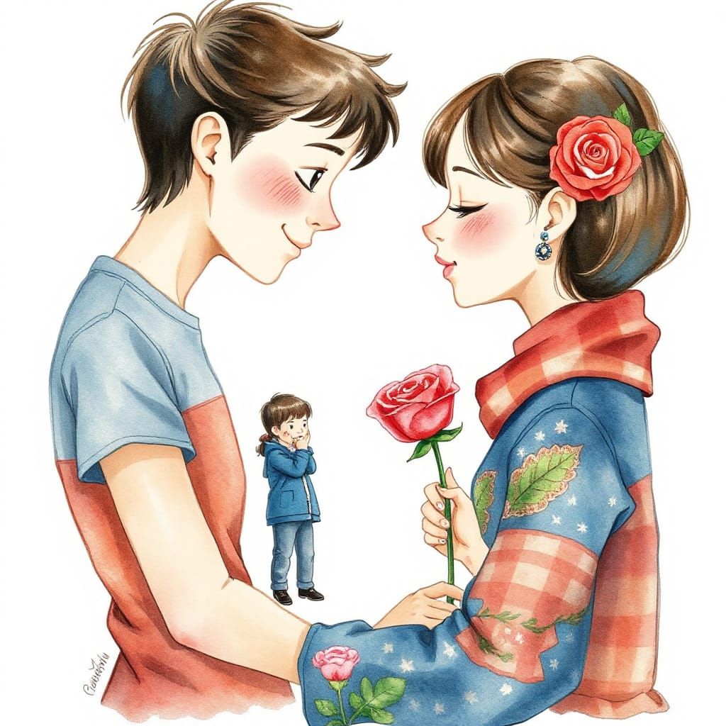 This image shows an adorable love story unfolding in detailed watercolor illustration. The artwork captures heartwarming moments with delicate finesse and vibrant color washes.