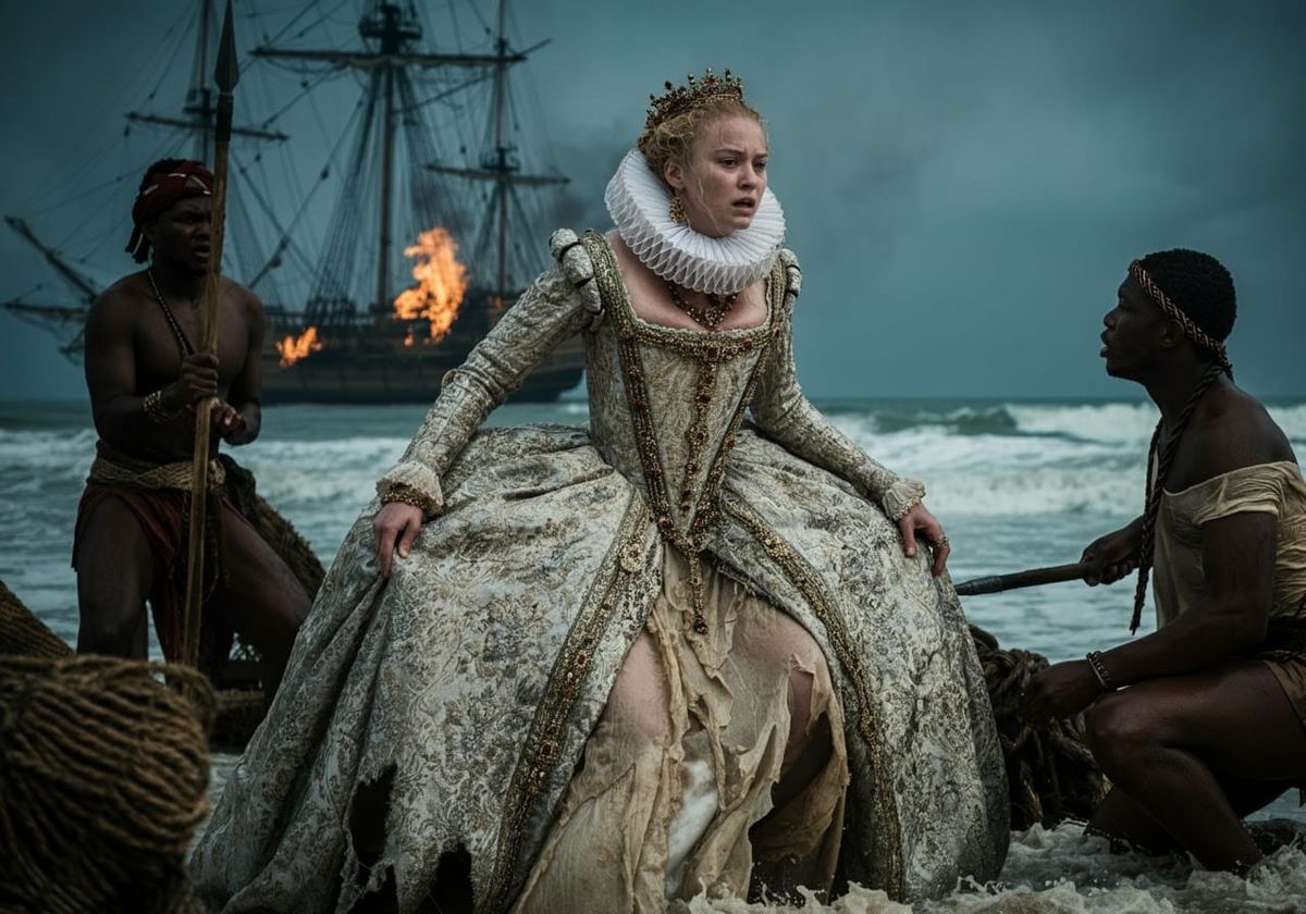 A dramatic image shows a shipwrecked Queen stumbling onto a beach as a tribal warrior approaches. She wears a tattered Renaissance gown with baroque jewels, set against a burning galleon, with dramatic lighting.