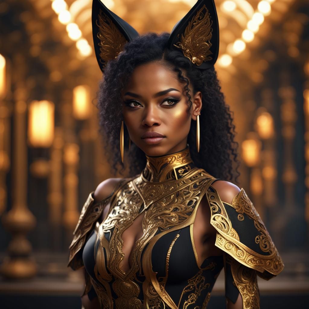 This image shows a mulatto teenage Kitsune in a black and gold dress. The digital painting features intricate details, deep colors, and complementary color schemes.