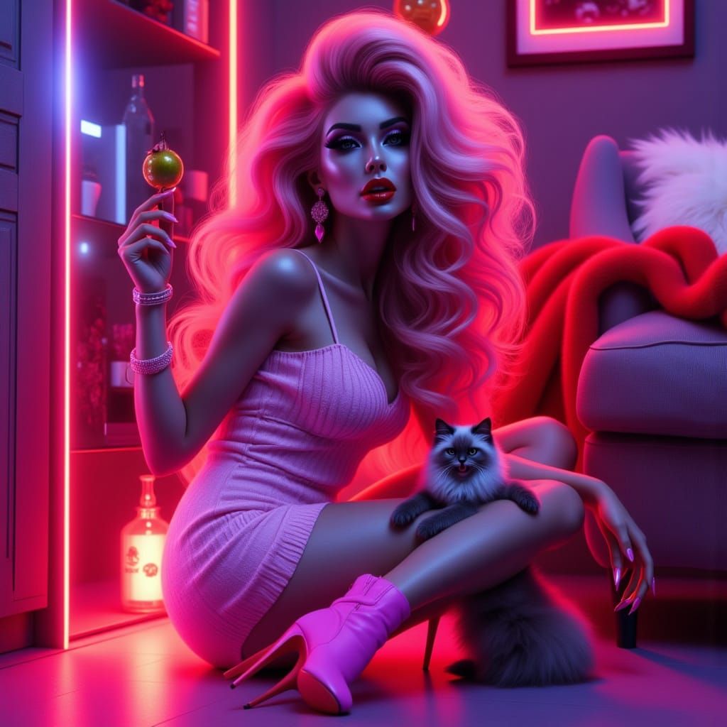 This image shows a fashionably dressed woman with vampire fangs, red lipstick, and a cute kitten at her feet, surrounded by bright neon colors and pastel hues.