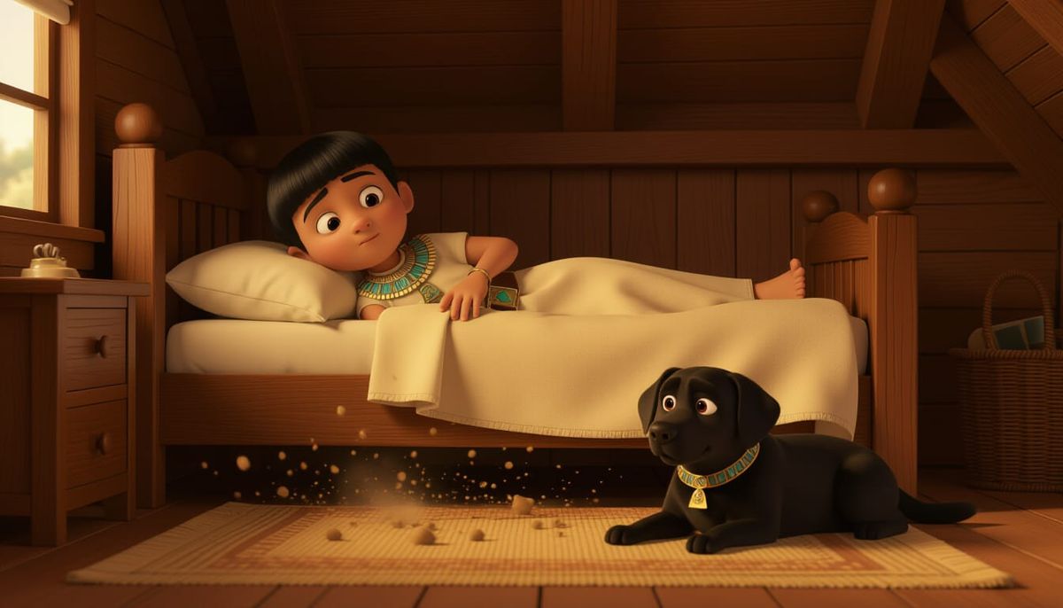 This 3D Pixar-style image shows a young boy, King Tut, sleeping peacefully on a wooden bed during a powerful earthquake. A loyal black Labrador rests beside him, unfazed by the shaking room.