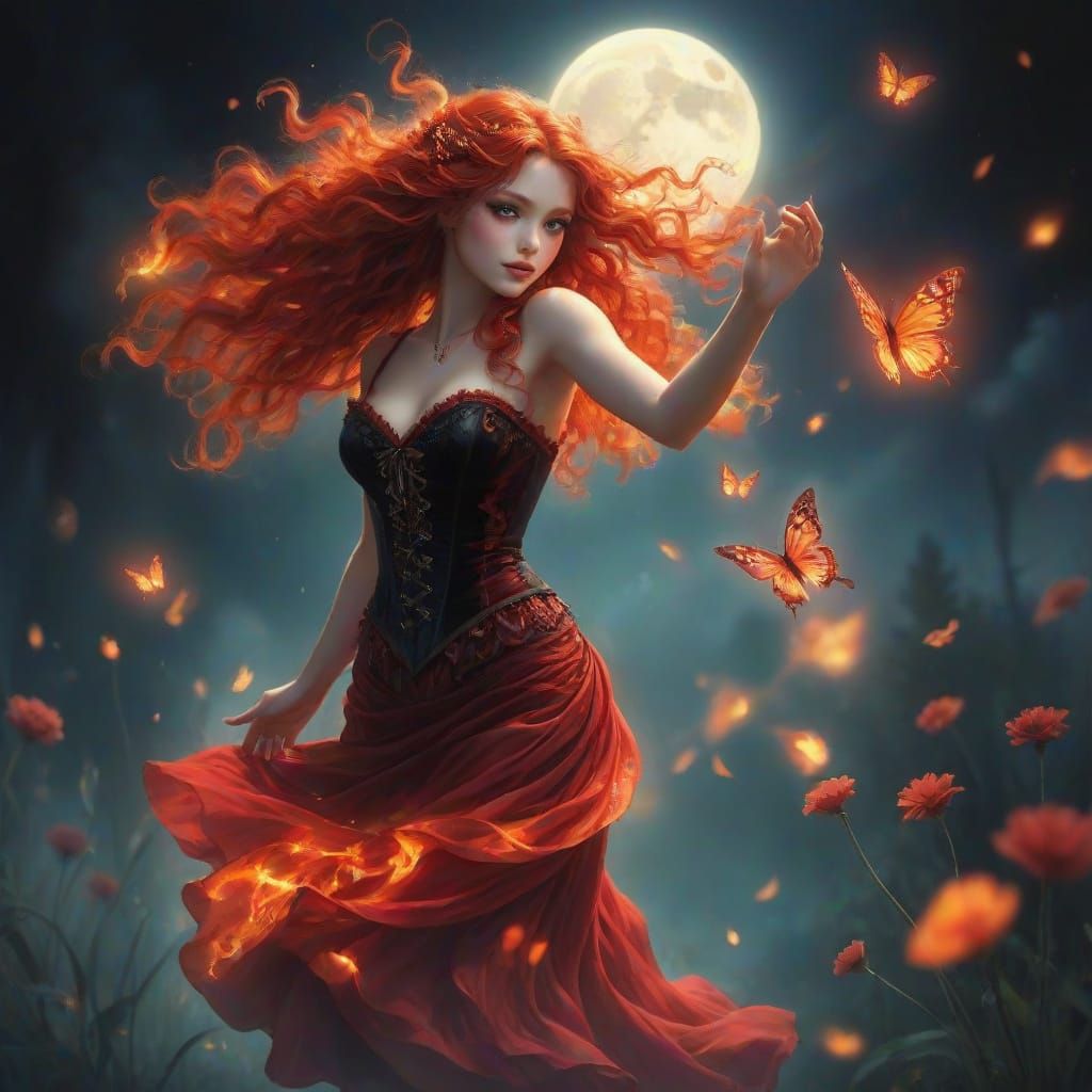 This image shows a fairy with long, fiery red hair dancing in a moonlit garden. She wears a red and black velvet corset dress with living flames, depicted with soft lighting and vibrant colors in an anime realism style.