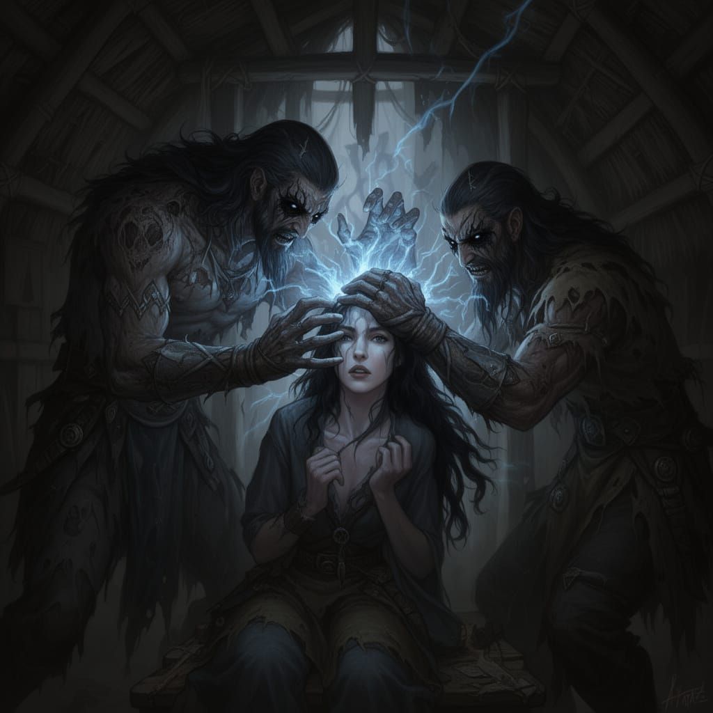 This image depicts a terrifying scene where Karina is captured by a Dreamweaver and Elkon, who forcefully invades her mind with dark power.