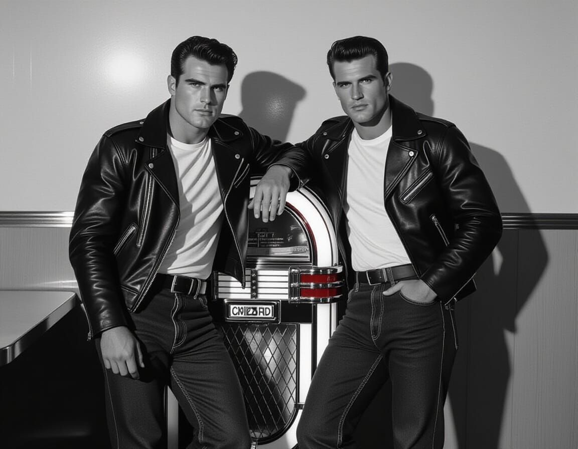 This image shows a high-contrast black and white photograph reminiscent of 1950s fashion photography. Two young men in biker attire lean against a diner jukebox, exhibiting a confident, iconic pose with minimalist background.