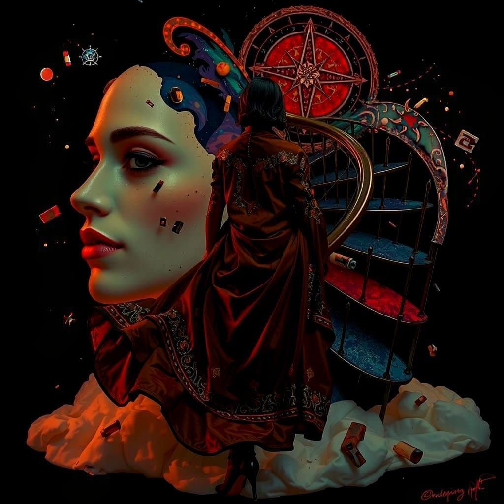 A striking picture of a woman in an Art Deco gown on a swirling staircase. The scene features scattered objects and symbols, set against a vibrant, abstract sky in hyperrealistic concept art.