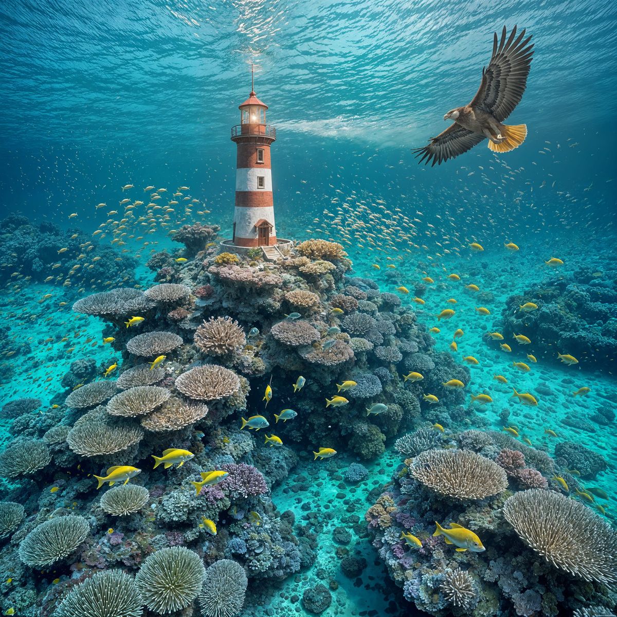 A hyperrealistic image shows a lighthouse among coral reefs off Palawan Island. Colorful fish swim in the clear waters, while a biomechanical Philippine Eagle flies above, reminiscent of nature photography.