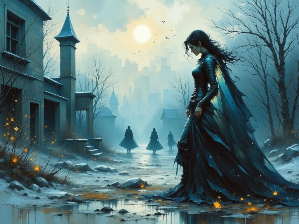 This image shows a multi-layered double exposure of war scenes superimposed on a French village silhouette. Rendered with expressive brushstrokes and a melancholic atmosphere in somber blues and greys.