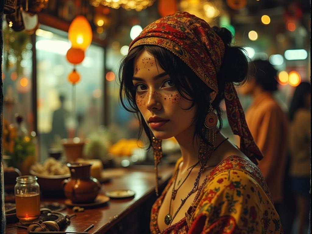 A highly detailed, high-contrast lomography image of a multicultural alien cyberpunk bar. Features intricate textures and sharp focus.