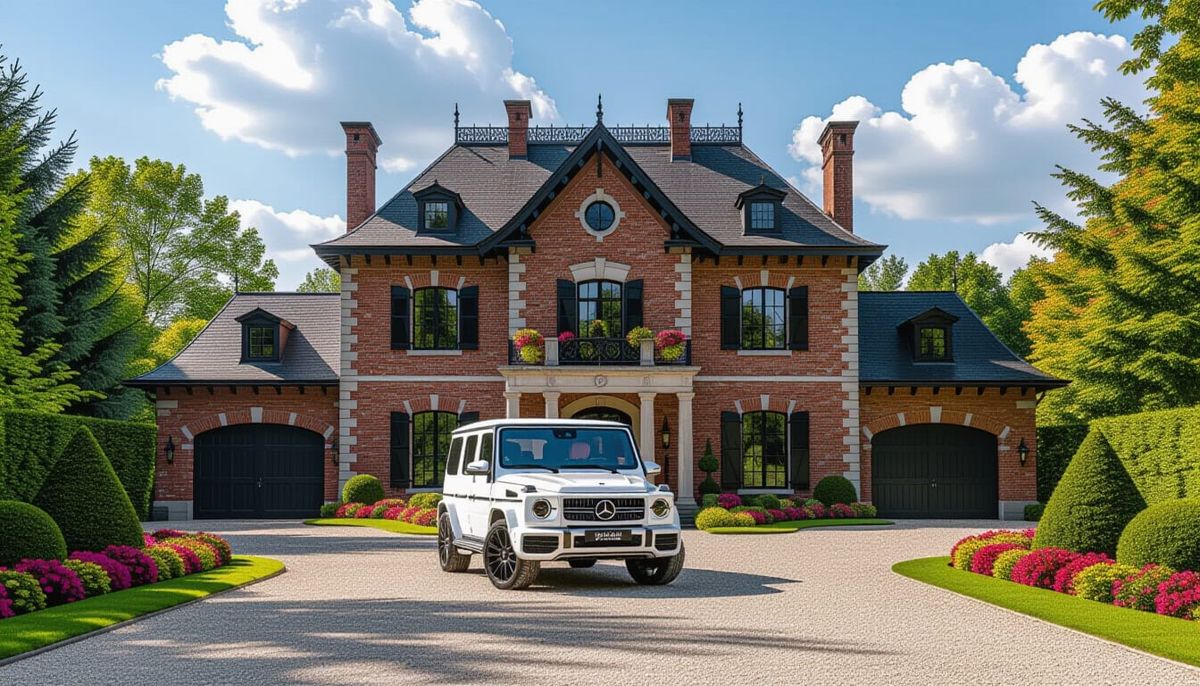 This image shows a grand Victorian brick chateau with an attached garage, a white Mercedes AMG G 63, vibrant trees, and a flower garden under a blue sky. Features painterly realism with visible brushwork.