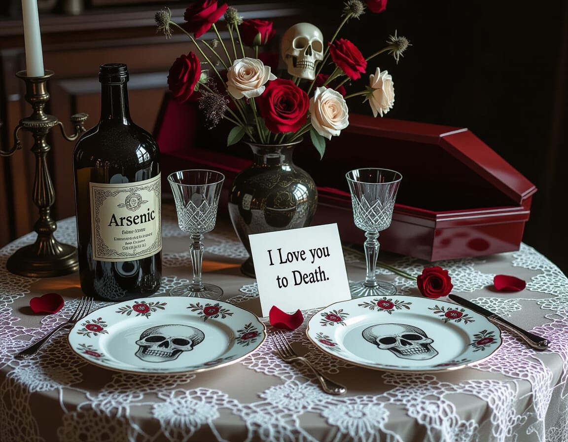 A Valentine's Day table is set with an elegant lace-trimmed tablecloth. There's a dusty big bottle labeled ARSENIC in capital letters, two cracked glass goblets, a cobweb-covered candelabrum, and two (only two!) fine porcelain plates decorated with ghosts and skulls. At the center of the table sits a ...