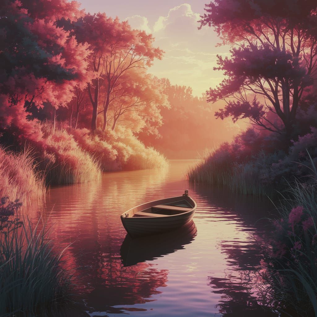 This image shows a small wooden boat floating on a tranquil lake surrounded by lush vegetation. The scene is bathed in the warm light of the late afternoon sun, rendered in a painterly style.