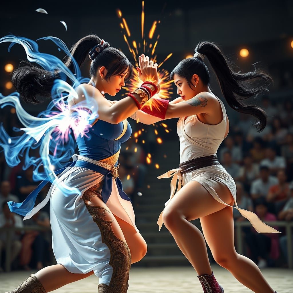 This image captures the intense battle between Chun-Li and Mai Shiranui, showcasing their powerful moves and beautiful fighting styles in a stunning photorealistic setting. The scene is brought to life with breathtaking visual effects, including magical powers and dramatic lighting.