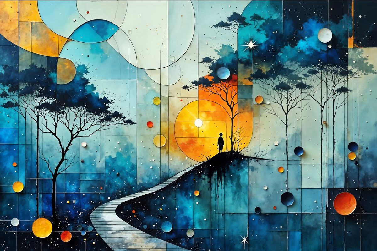 This abstract expressionist artwork features a dreamlike, ethereal atmosphere, blending celestial elements with a purely abstract geometric splash art aesthetic, creating a captivating cosmic vortex.