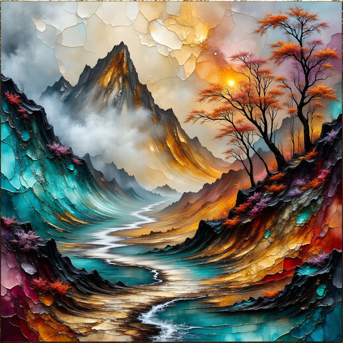 This image shows a breathtakingly detailed mountainscape with a sense of longing and nostalgia. Geometric patterns and crinkled metallic textures add depth and visual interest to the scene.