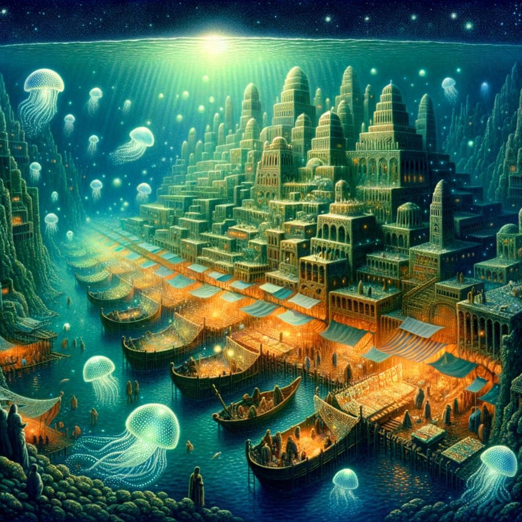 A vibrant marketplace in the underwater city of Atlantis. Bioluminescent creatures illuminate stalls filled with exotic marine goods. Artfully depicted in the style of a medieval oil painting, with warm and cool tones.