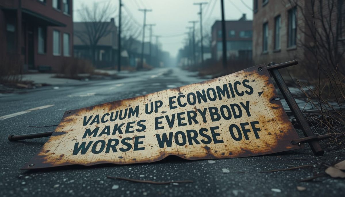 This image shows a dilapidated banner with a warning about economics, discarded on a lonely street. The scene is rendered with hyperrealism and cinematic flair, in a high-contrast, moody tone.