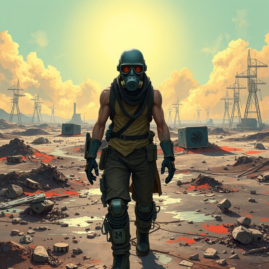 Across a wasteland of silence and ruin, beneath the blinding light of a poisoned sun, he advances. His steps are slow, but never hesitant. Each bootprint in the ash is a sentence, each movement a refusal to disappear. His muscles are armor, his mask a memory of air.