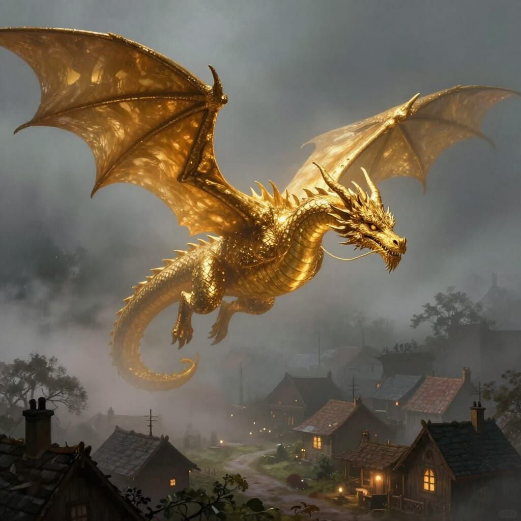 This epic fantasy illustration depicts a giant, glowing golden dragon surveying a quaint, fog-shrouded village from above. Dramatic lighting and rich colors create an awe-inspiring, mysterious scene.