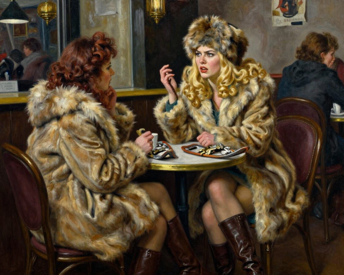 A dramatic oil painting depicts an angry blonde woman in a Moscow cafe in 1973, with snowshoes on the table. Features chaotic energy and stark lighting.
