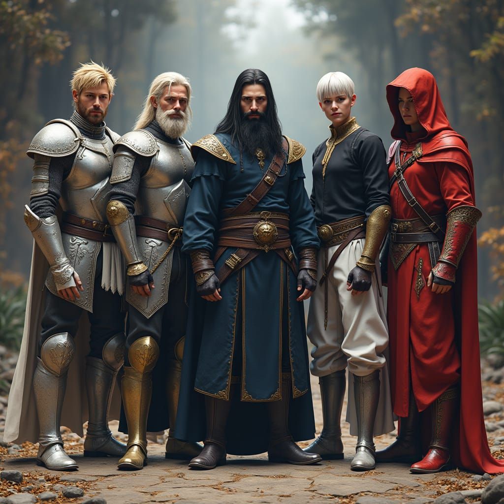 This image depicts five heroic figures from a medieval fantasy world, posed in unison against a richly detailed background. The warriors and wizards are dressed in ornate attire, showcasing intricate designs and vibrant colors.