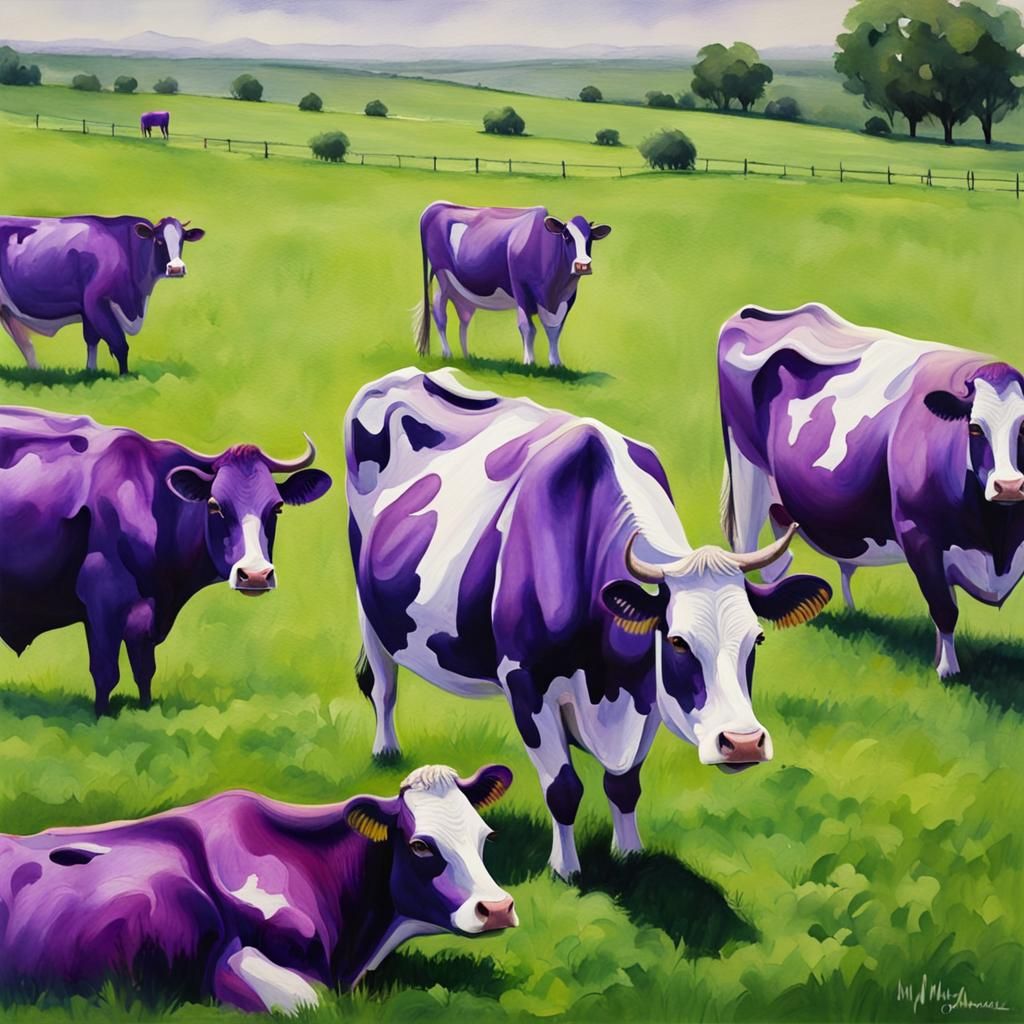 A photorealistic purple cow stands out in a field of green. The artwork employs thick brush strokes and layers of gouache watercolors to create a textured, impressionistic style.