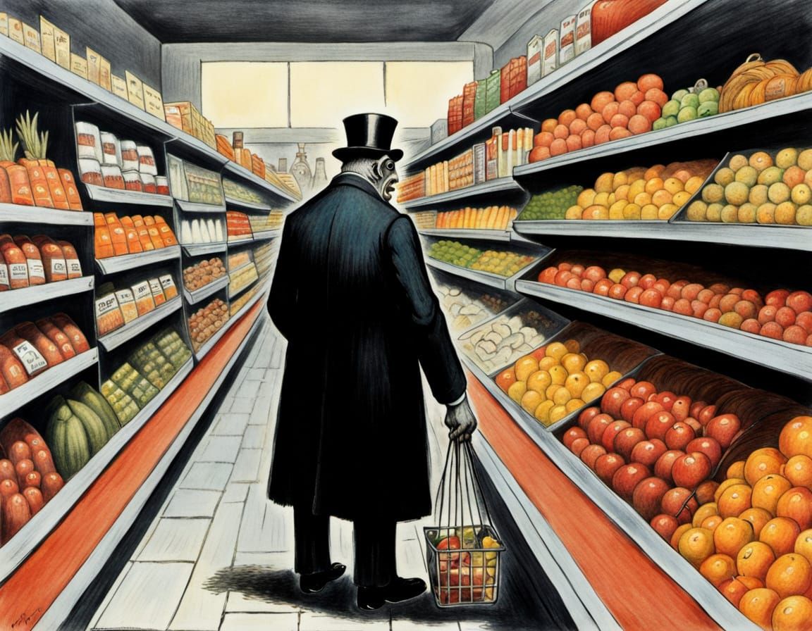 This image depicts a monster doing his weekly shopping at the supermarket. The artwork is reminiscent of surrealist illustrations and dark, macabre lithographs.