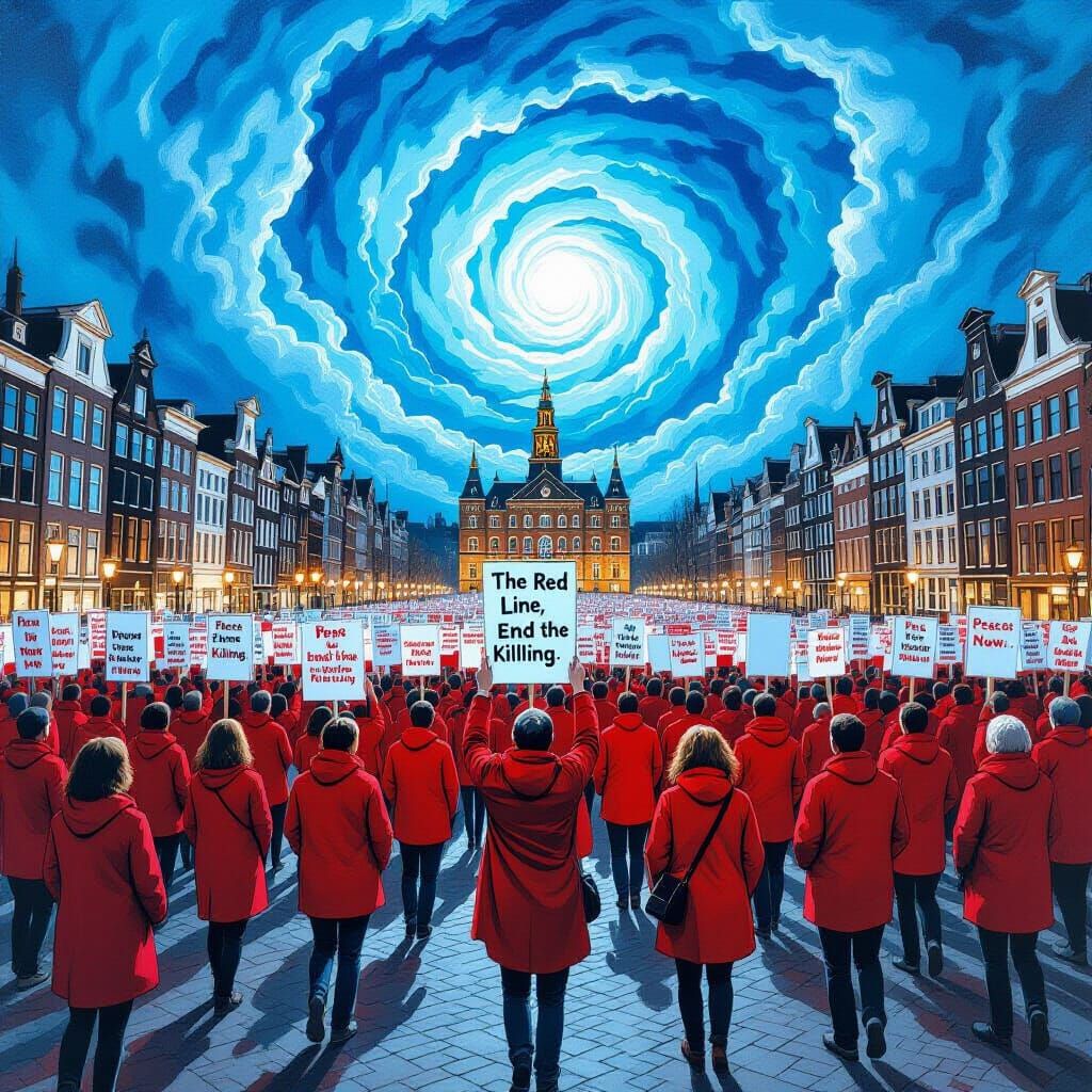 colour etching. There is a massive protest as far as the eye can see, in a huge public square in Amsterdam. All the people are dressed in Red. The Red Line, end the killing it says on posters. And Peace Now. The sky is a swirling vortex of blues and there is a dreamlike atmosphere with soft, diffused ...