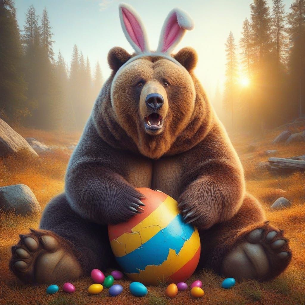 This vibrant photograph captures a close-up of an obese Kodiak bear wearing bunny ears, sitting on a colorful broken egg amidst morning woodland foliage and Easter-themed props, with soft light filtering through trees.
