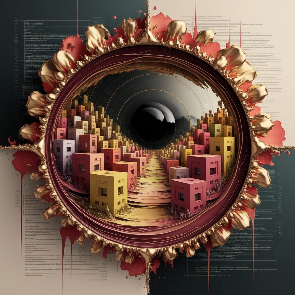 This image shows an abstract kintsugi painting of square houses in a surreal, dreamlike style. Warm light illuminates the earthy-toned scene with lines of code and geometric shapes, reminiscent of intricate paper cutouts.