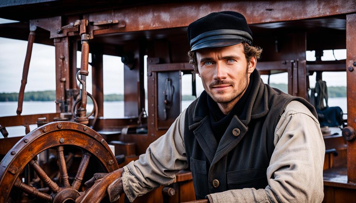 This image shows a young man working on a riverboat. He is standing at the wheel, wearing worn boots, a thick sailor's coat, and a black woolen hat.