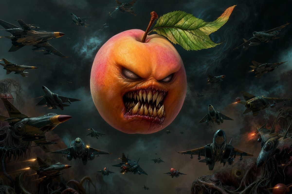 This image shows a horrific, detailed illustration of an angry, fanged peach with fighter jets. Bizarre fruits and aircraft fill the background in a surreal, Giger-esque style with ominous lighting.
