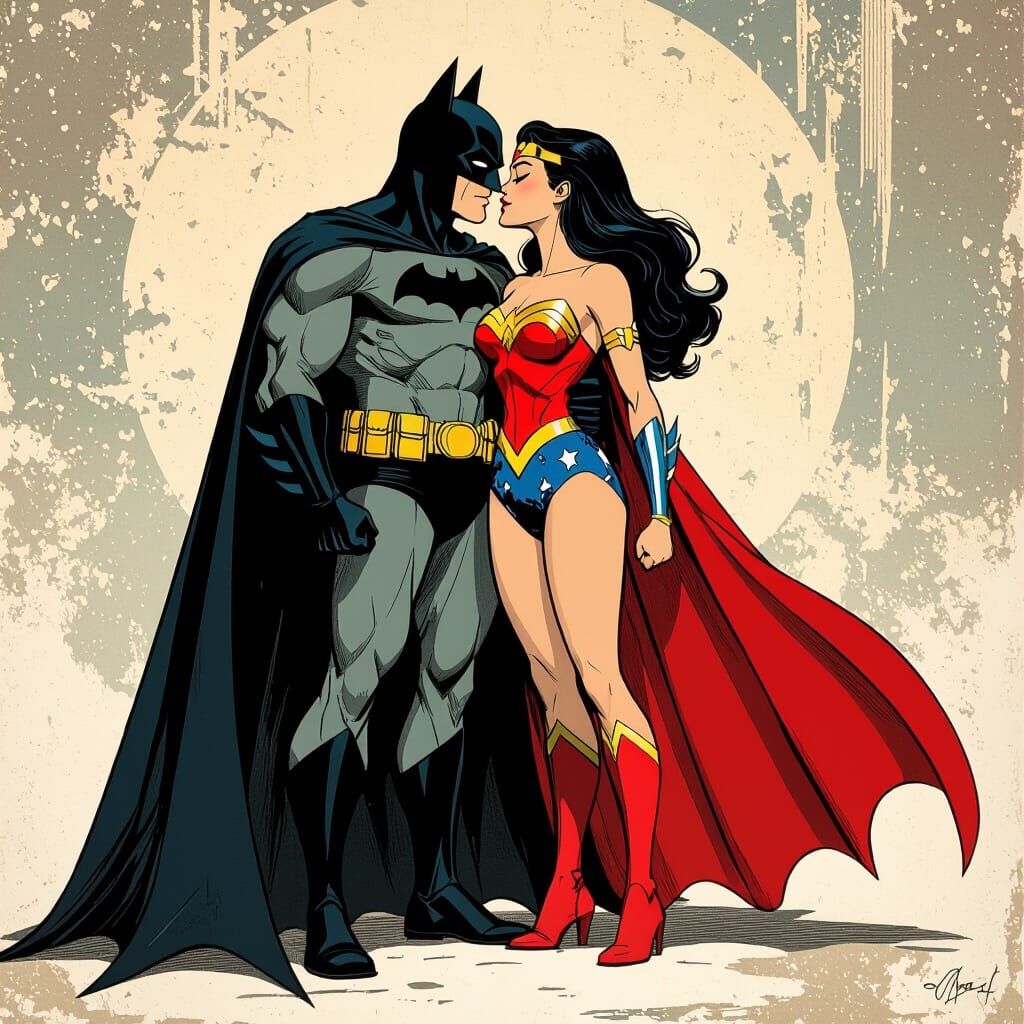 This image shows Batman and Wonder Woman embracing and kissing passionately. The artwork blends the romanticism of Hayao Miyazaki with the dramatic style of Ash Thorp, inspired by Frank Frazetta.