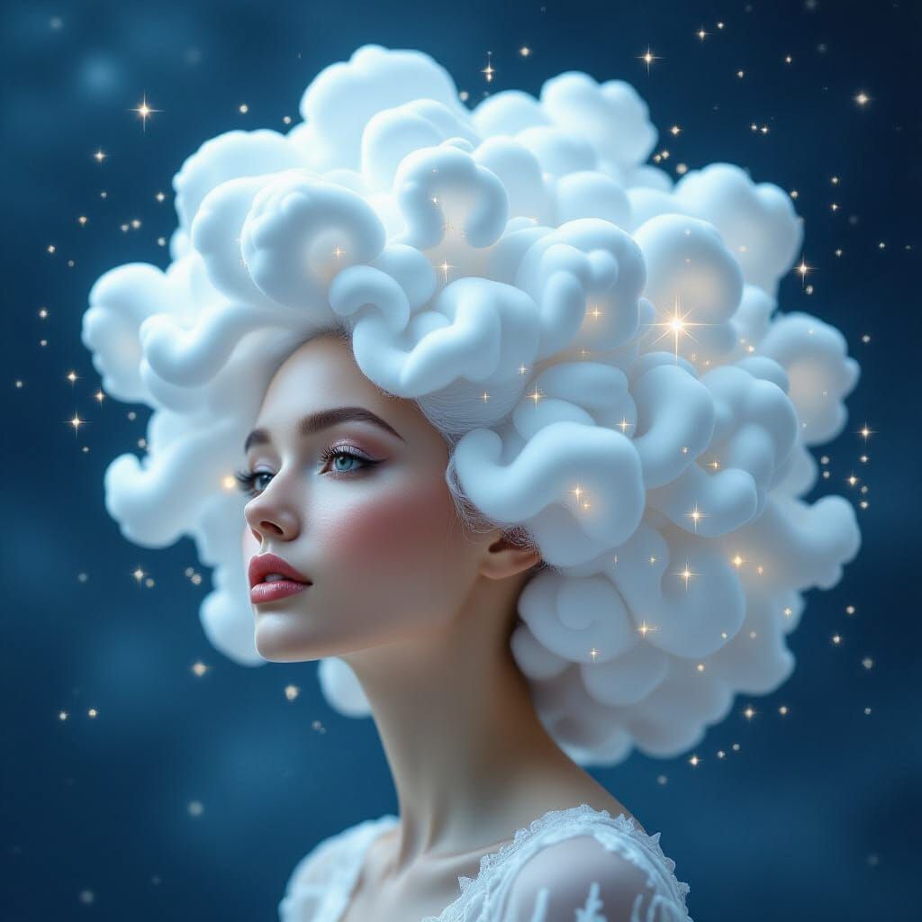 This image shows a woman with her hair styled as white clouds and stars, looking thoughtfully into the distance. The portrait is surreal digital art with a soft focus.