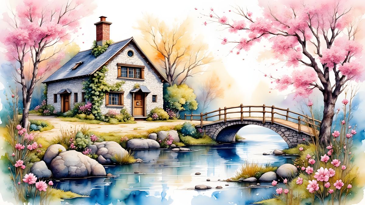 This image shows a cottage next to a flowing stream, complete with a stone bridge and cherry blossom trees. The artwork is rendered in a watercolor style.