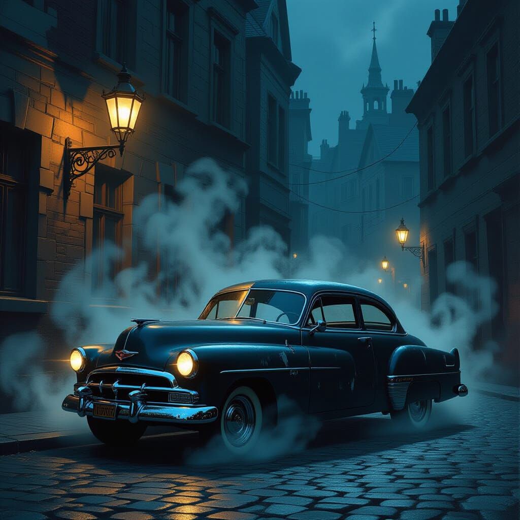 Dark fantasy concept art. A lone, tattered vintage car parked on a cobblestone street at midnight. Volumetric mist swirls around the tires, illuminated by a single, flickering gas lamp. Dramatic chiaroscuro lighting casts long, eerie shadows. A sense of forgotten history and melancholic beauty. Oil painting, ...