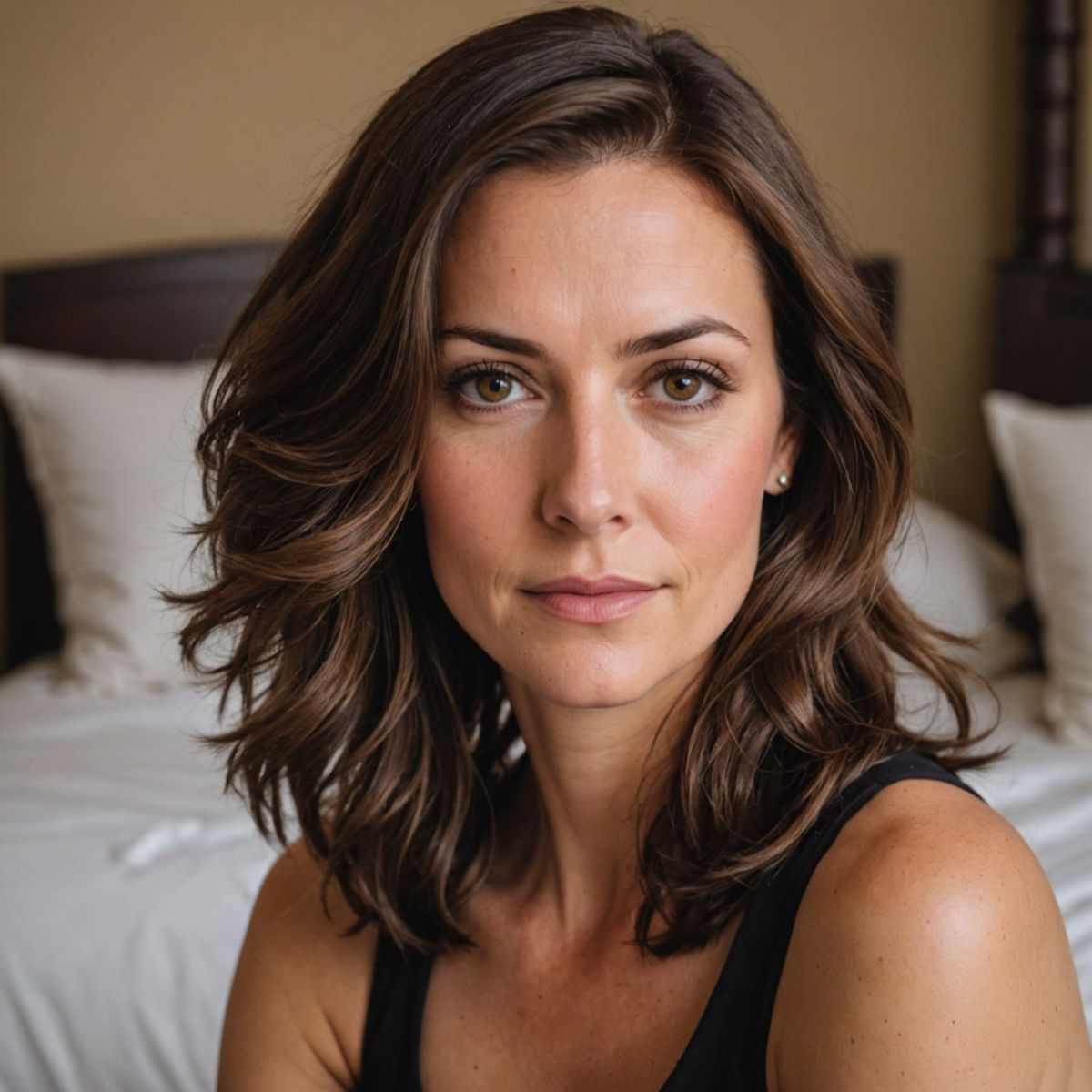 This image features a boudoir-style photograph of a 35-year-old German-American woman with shoulder-length brown hair and deep brown eyes, captured in a sensual and intimate setting.