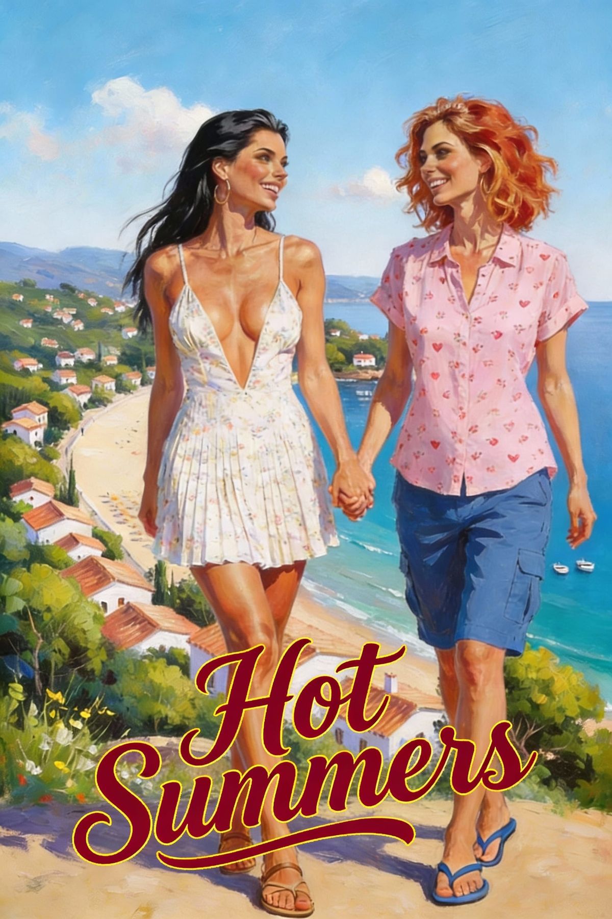 This image shows two women holding hands and looking happy, superimposed on a romantic scene. The words "Hot Summers" are displayed in a cheerful font, perfect for a romance novel cover.