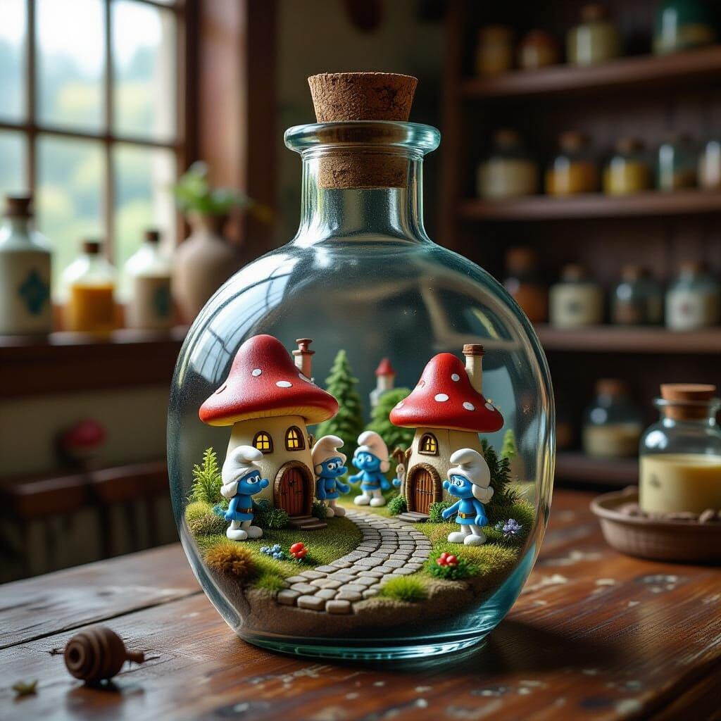 This image shows a Smurf village inside a glass bottle. Mushroom houses and tiny Smurfs are visible, rendered in a whimsical style. The scene evokes a nostalgic and enchanting atmosphere.