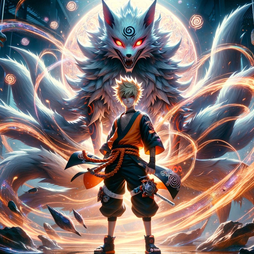 This image shows a young ninja amidst swirling chakra energy, with a nine-tailed fox imprisoned behind him. It's a detailed matte painting with luminous effects and high-contrast lighting, in an anime-inspired style.