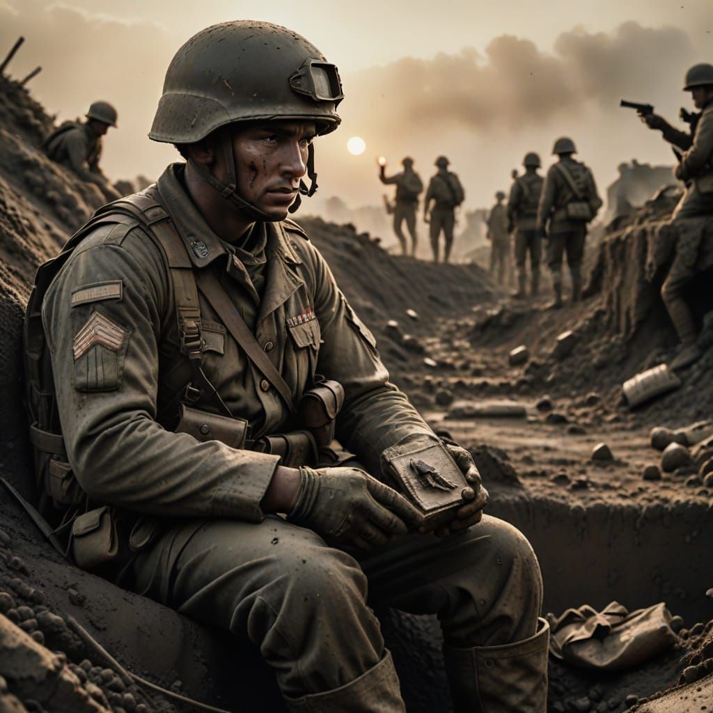A poignant image showing a soldier in a trench at dawn, holding a family photo. The scene, rendered in detailed 3D, captures the soldier's humanity against the backdrop of war.