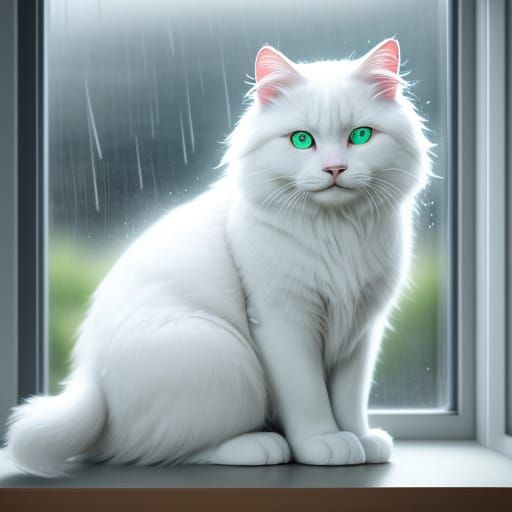 This digital art showcases a fluffy white cat with bright green eyes on a window sill, watching the rain. The composition features dynamic lighting and contrasting cool blue and warm orange colors, rendered in a highly detailed masterpiece.