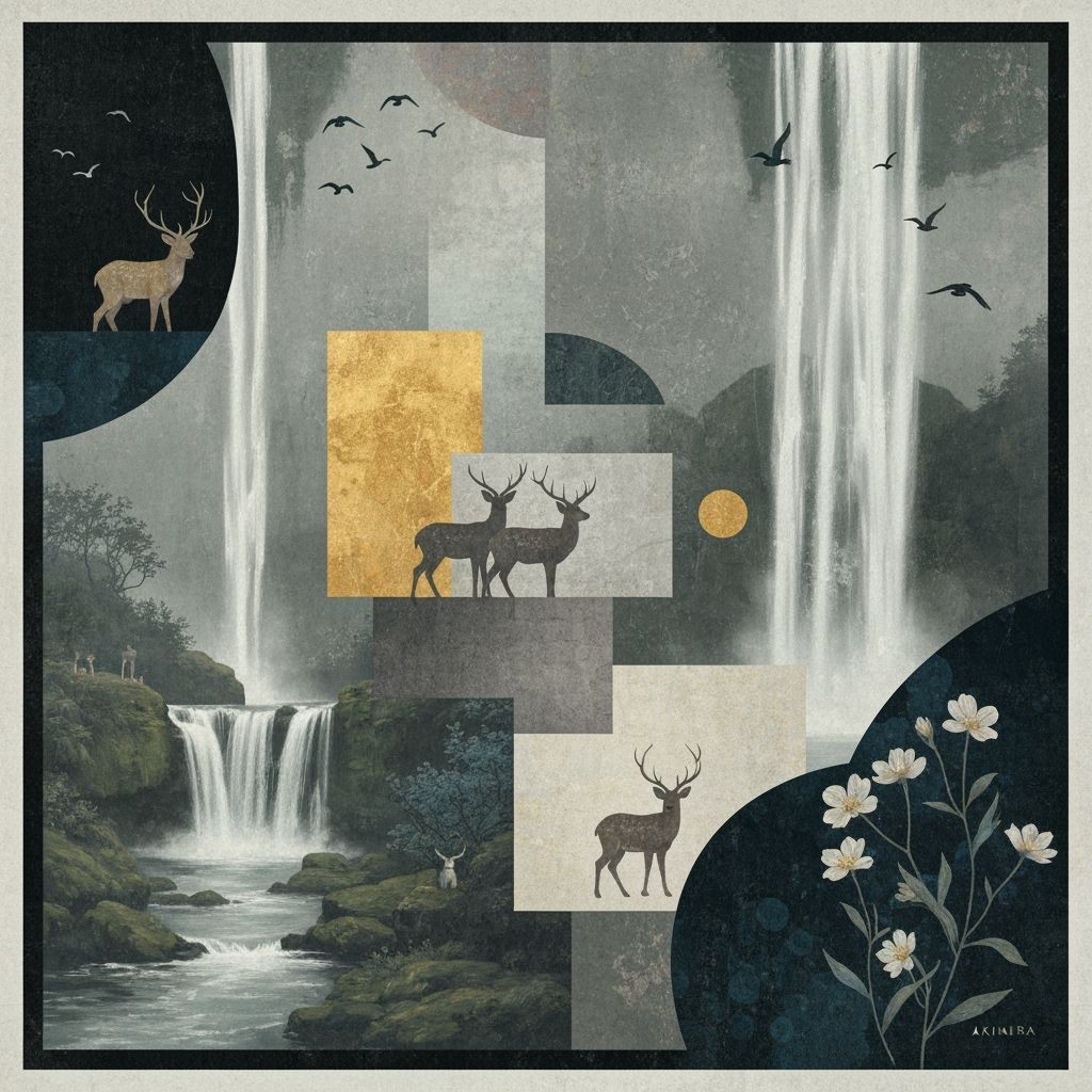 A captivating image showcasing waterfalls, deer, and birds in a vintage anime style. The artwork features soft, painterly images with a dreamy, semi-abstract feel, layered shapes and muted tones.