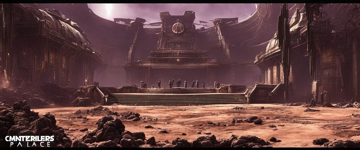 A desolate landscape depicts the exterior of Mongul's palace arena on Warworld. This image showcases a stark and imposing architectural structure within a wasteland setting.