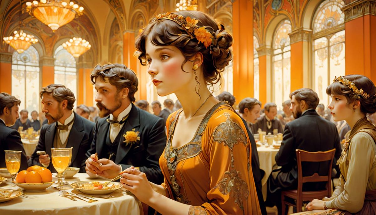 This image shows a group of people dining in a magnificent hall, depicted in the Art Nouveau style. The artwork features warm colors and golden lighting, reminiscent of Alphonse Mucha's distinctive style.