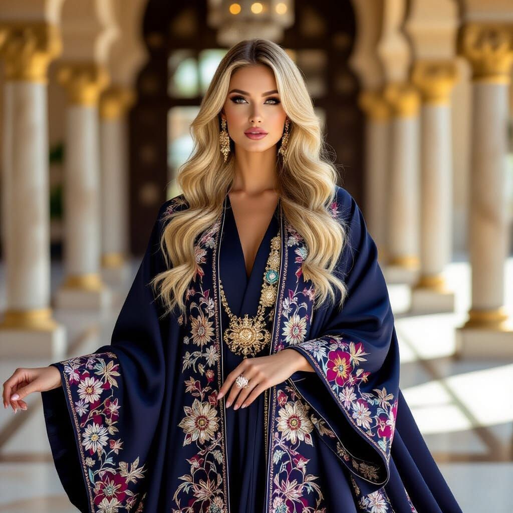 This image shows a regal blonde woman modeling a modern, high-fashion abaya. The opulent jewel tones and intricate embroidery, combined with the lavish setting, create a cinematic aesthetic.