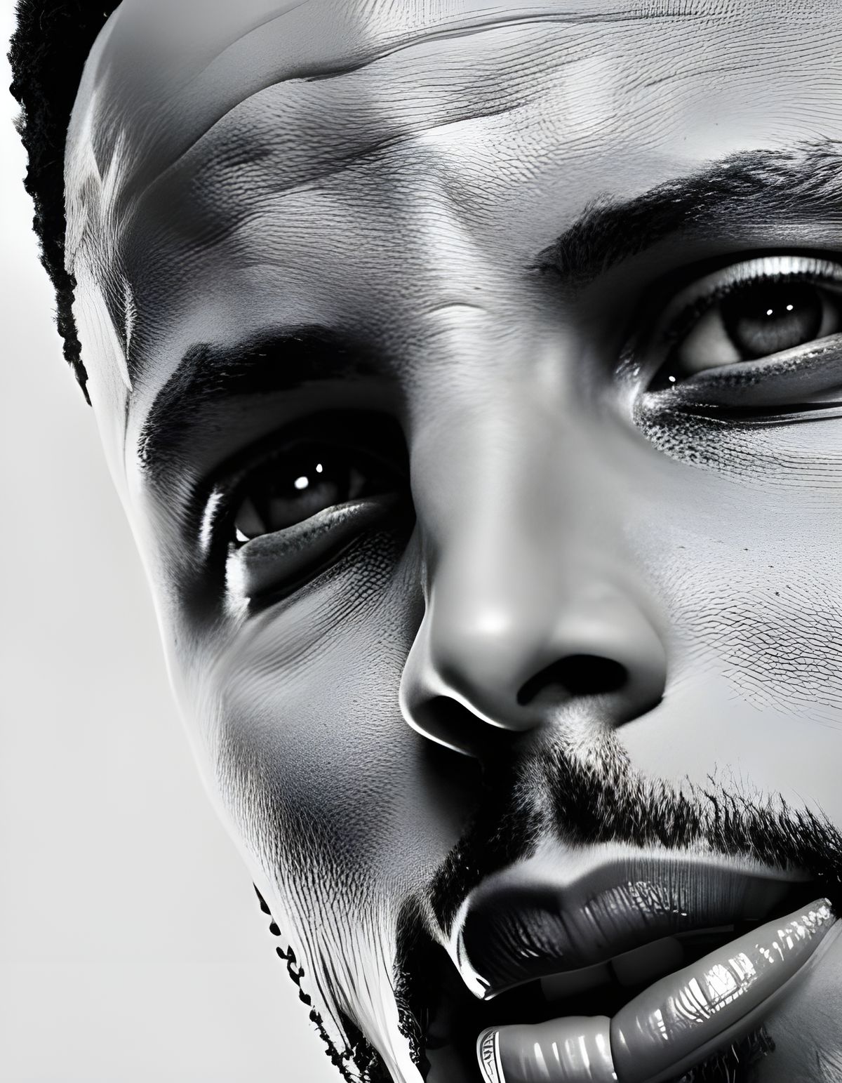 A detailed close-up portrait of basketball star Steph Curry. This striking image captures his intense focus and athletic prowess.