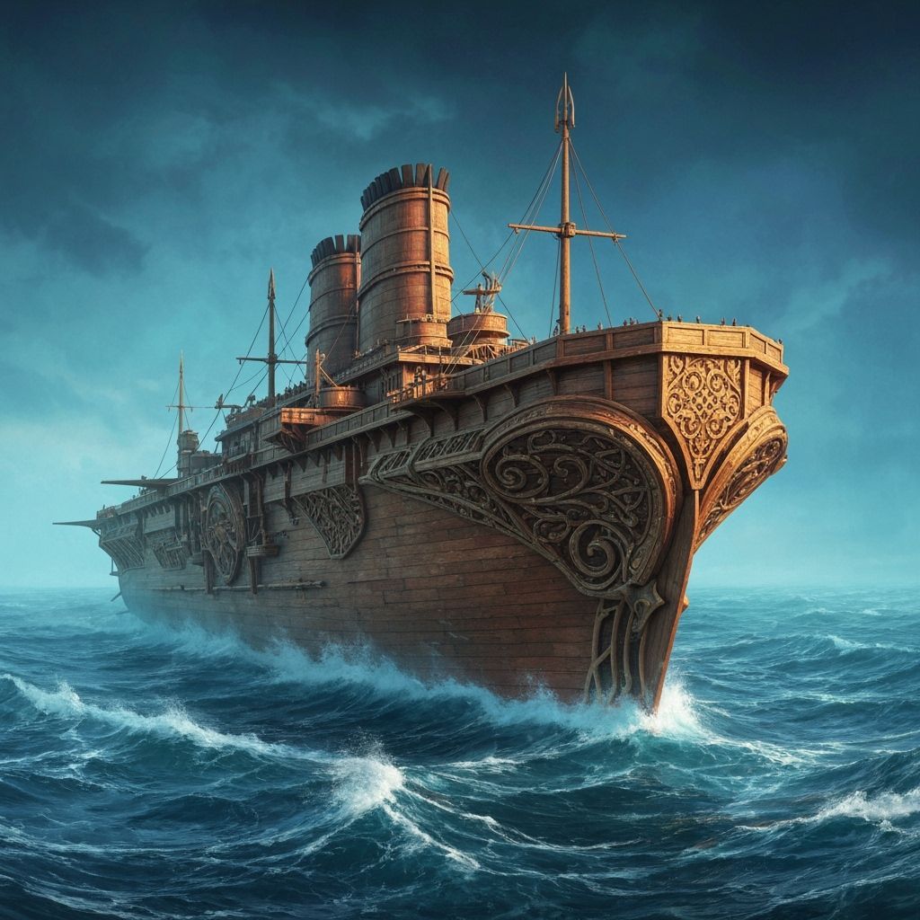 A stunning image of a wooden aircraft carrier sailing on a stormy sea. This detailed matte painting features fantastical elements, deep blues, and golden hues, rendered in 8k resolution.