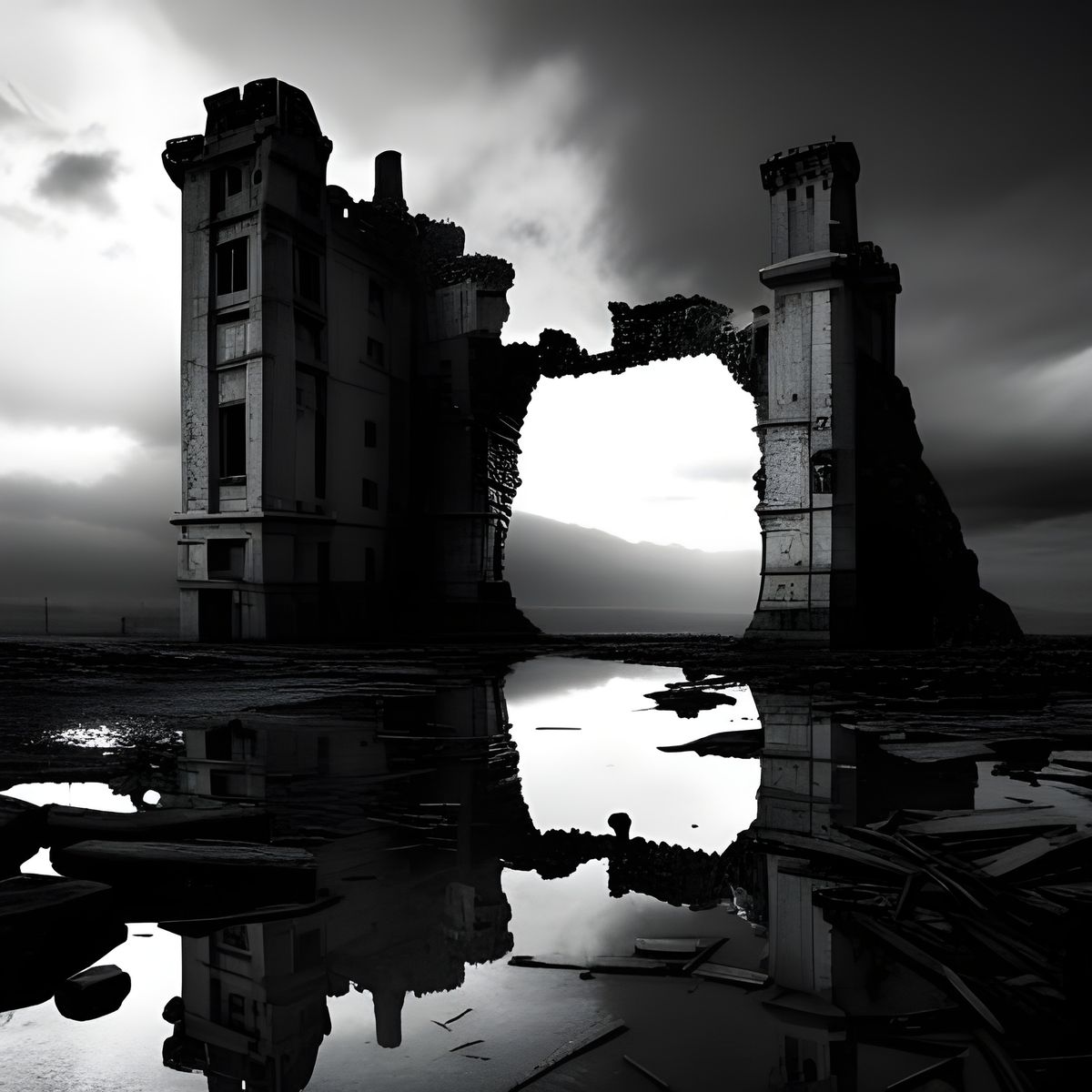 This image shows a ruined castle in a state of decay. The scene is cinematic with rainy weather and a reflective surface, rendered with a painterly style.