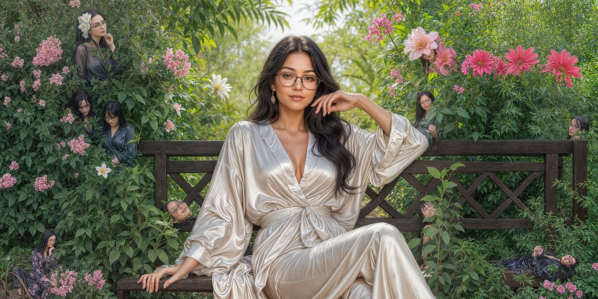 This image showcases a woman with dark hair and glasses, adorned in glossy silk loungewear, relaxing on a bench amid a lush garden. The scene is rendered with flowing lines and a dreamy aesthetic.