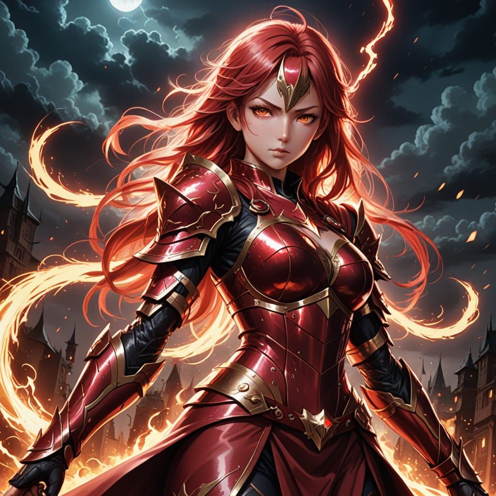 This anime illustration depicts a powerful sorceress in detailed crimson armor, crackling with vibrant red lightning. The artwork features expressive character design and dramatic lighting.